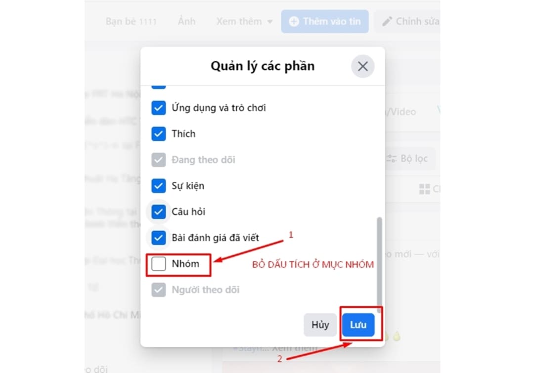 Bước 4: Tại đó, bạn sẽ nhìn thấy tất cả các mục đang được hiển thị trên dòng thời gian công khai của Facebook. Tìm kiếm mục “Nhóm”, bạn hãy bỏ dấu tích cạnh nó và ấn “Lưu”.