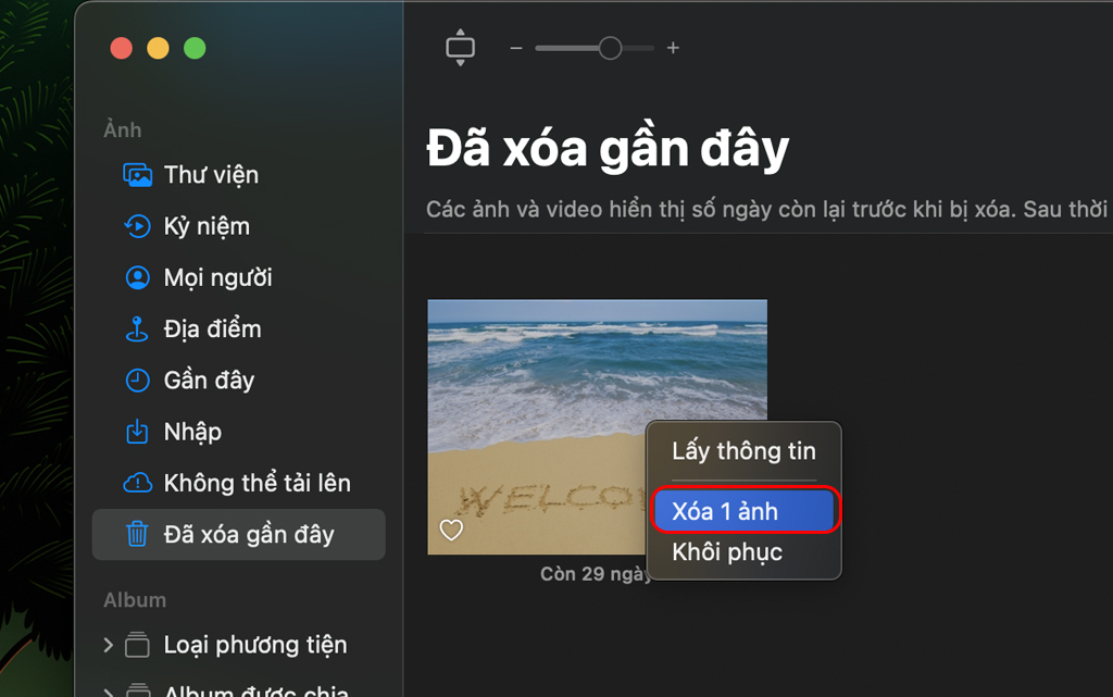 Ghi chú: Album Đã xóa gần đây chỉ xuất hiện trong thanh bên sau khi bạn xóa các ảnh. Nếu bạn xóa hoặc khôi phục các ảnh từ album Đã xóa gần đây và album trở nên trống thì album sẽ biến mất khỏi thanh bên.