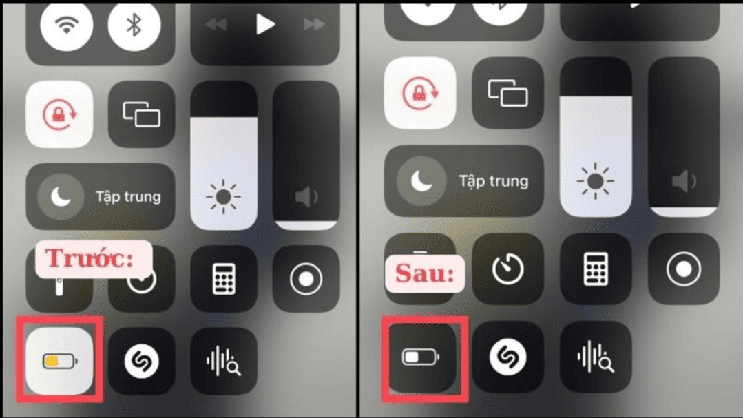 - Bước 1: Vuốt từ dưới màn hình lên để mở Trung tâm điều khiển (Control Center), sau đó kiểm tra biểu tượng Chế độ Nguồn điện thấp (hình viên pin màu vàng nếu đang bật).