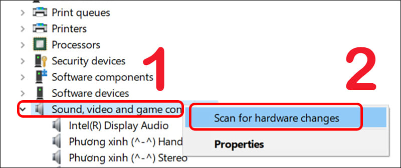 Bước 4: Chuột phải vào mục Sound, video and game controllers rồi chọn Scan for hardware changes.
