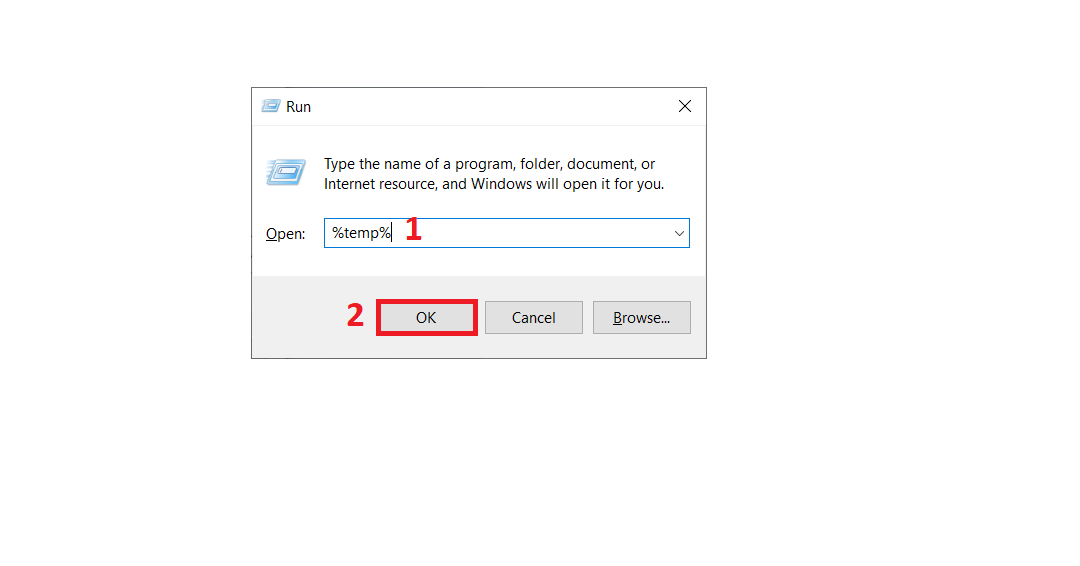 • Bước 1: Bạn hãy nhấn tổ hợp phím “Windows + R” trên bàn phím máy tính để có thể mở hộp thoại Run → bạn tiến hành nhập lệnh “%temp%” (như hình minh họa phía dưới) → bấm nút “Enter”.