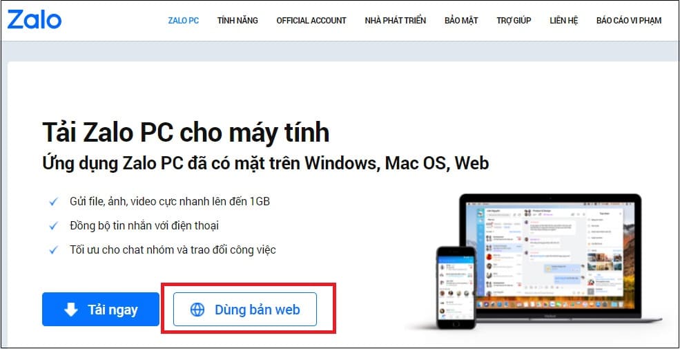 Bước 1: Nhấn vào link dưới đây và bấm tải ngay: https://www.zalo.me/pc .