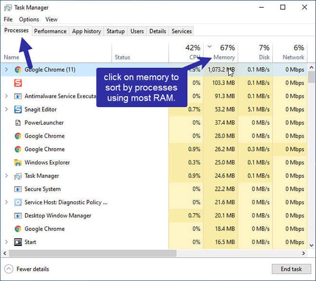 Theo đó, bạn hãy lựa chọn Tab Processesm tiếp theo sau đó sắp xếp danh sách các chương trình đang tiêu tốn RAM theo thứ tự cao xuống thấp. Việc này sẽ giúp cho bạn có thể phát hiện cái gì đang tiêu thụ nhiều bộ nhớ RAM của mình, và có thể nó không cần thiết.